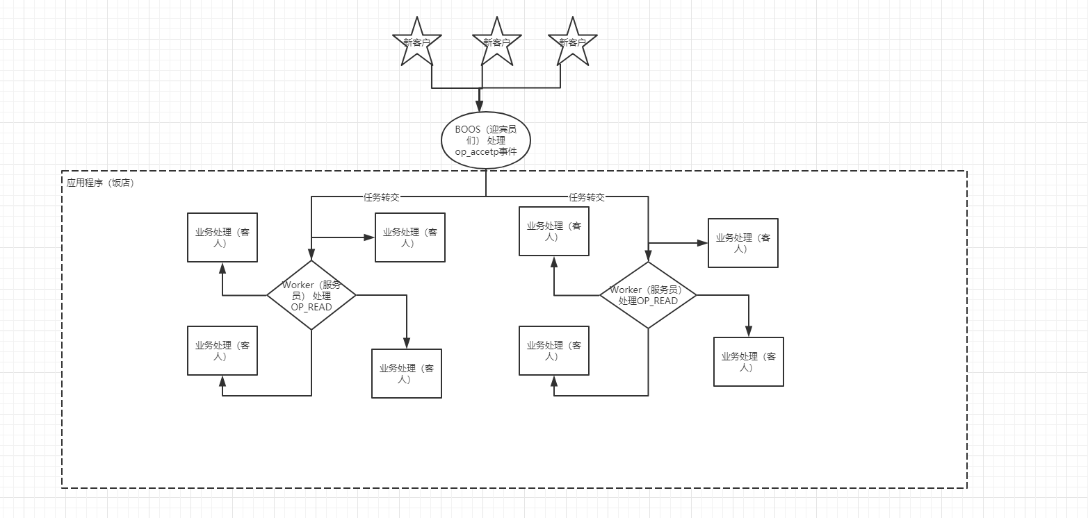 上面的这两个问题就好比我们去饭店点餐吃饭,如果就一个服务员(selector)。 既要在门口迎宾(serverChannel.register(selector, SelectionKey.OP_ACCEPT)后的相关处理),又要服务每一桌上的客人(channel.register(this.selector, SelectionKey.OP_READ)后的相关处理)。这种工作模式在有很多的客户情况下肯定是支撑不了的。要提高并发就要解决这个问题。