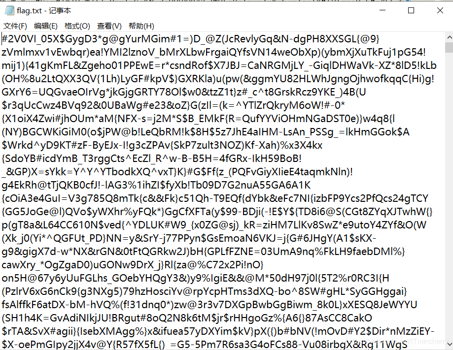 foremost一下,得到一个压缩包,包里有flag.txt,但是需要密码才能打开。尝试数字爆破,得到密码8864,打开之后得到一串奇奇怪怪的字符,