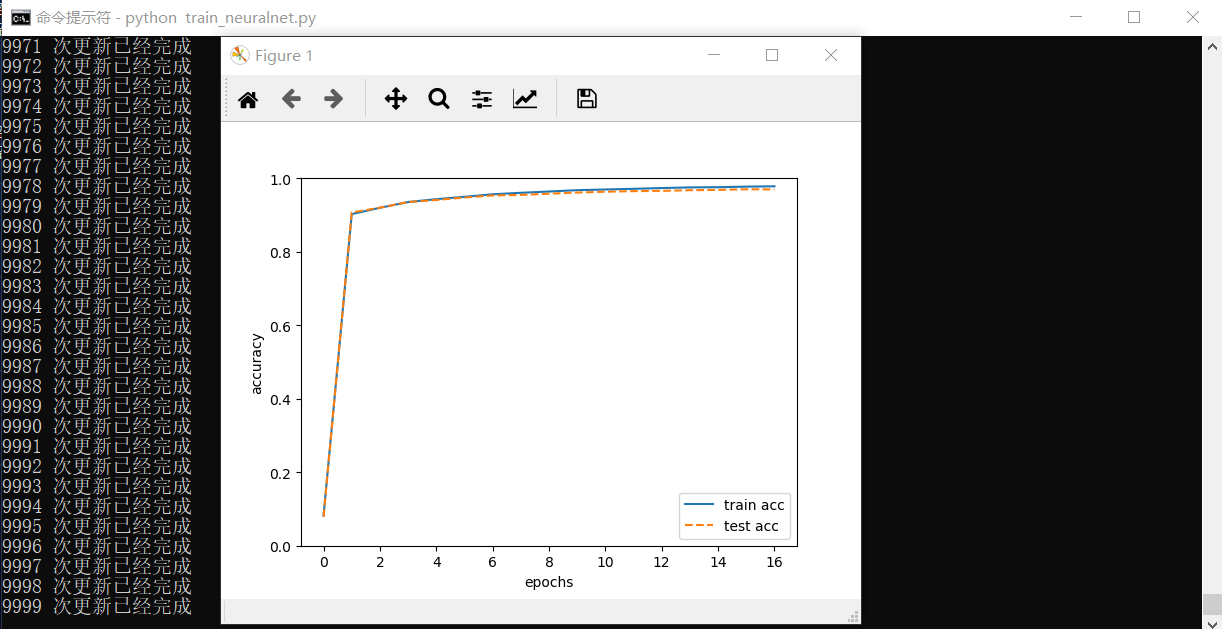 print(train_acc, test_acc) # 打印出训练数据和测试数据的识别精度(用于比较,观察是否存在过拟合现象)