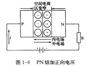 正向接法的时候,外电场的方向与PN结中内电场的方向相反,因而削弱了内电场,此时在外电场的作用下,P区中的空穴向右移动,与空间电荷区内的一部分负离子中和,N区中点电子向左移动,与空间电荷区内的一部分正离子中和,结果使空间电荷区的宽度变窄,最后形成一个较大的回路电流I,其方向在PN结中是由P区流向N区。