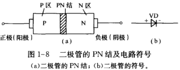 半导体二极管由一个PN结加两个引线电极组成,从P区引出线为二极管正极(阳极),从N区引出线为二极管负极