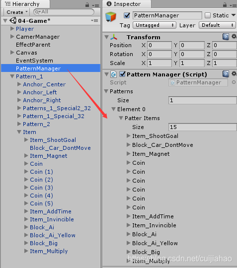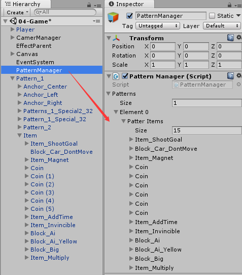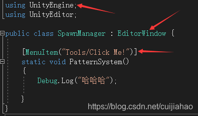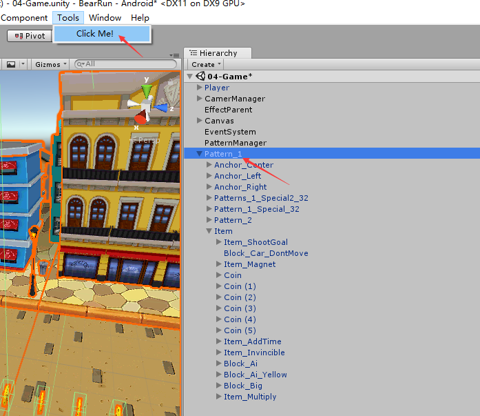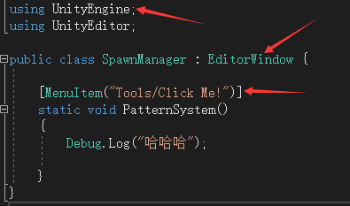 [MenuItem("Tools/Click Me!")] //创建菜单Tools/Click Me! static void PatternSystem() { GameObject spawnManager = GameObject.Find("PatternManager"); if(spawnManager != null) { var patternManager = spawnManager.GetComponent<PatternManager>(); if (Selection.gameObjects.Length == 1)//如果当前鼠标只点击了1个游戏物体 { var item = Selection.gameObjects[0].transform.Find("Item");//获取当前点击的游戏物体的item子节点 if (item != null) { //创建一套道路方案 Pattern pattern = new Pattern(); foreach (var child in item) { Transform childTrans = child as Transform; if(childTrans != null) { //找到它对应的预制体 var prefab = UnityEditor.PrefabUtility.GetPrefabParent(childTrans.gameObject);//返回游戏物体对应的预制体 if (prefab != null) { //设置道路上游戏物体的信息 PatterItem patternItem = new PatterItem { pos = childTrans.localPosition, prefabName = prefab.name }; pattern.PatterItems.Add(patternItem);//将游戏物体添加到方案里 } } } patternManager.Patterns.Add(pattern);//将道路方案添加到方案列表里 } } } } }