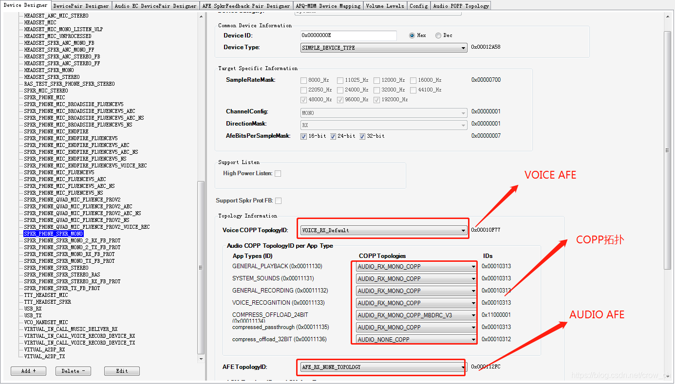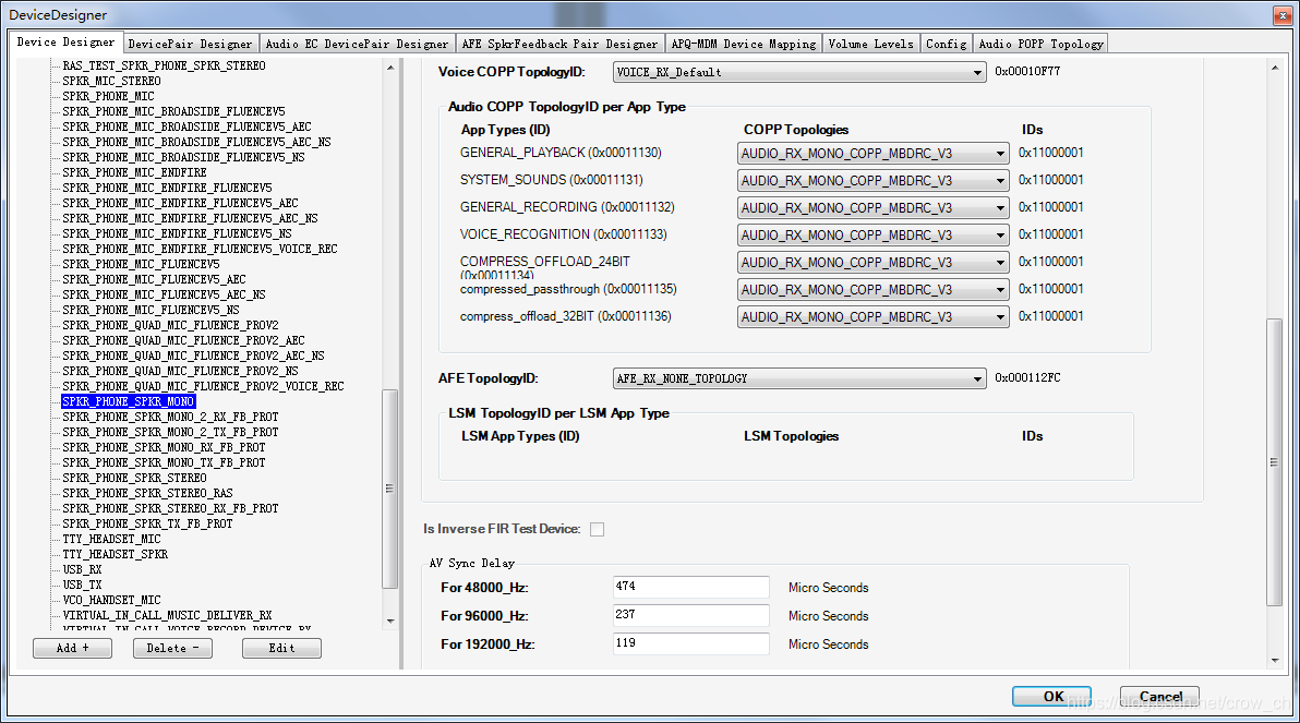 通过左上角菜单栏,选择Tools -----> Device Designer,并找到SPKR_PHONE_SPKR_MONO音效,如下图所示。