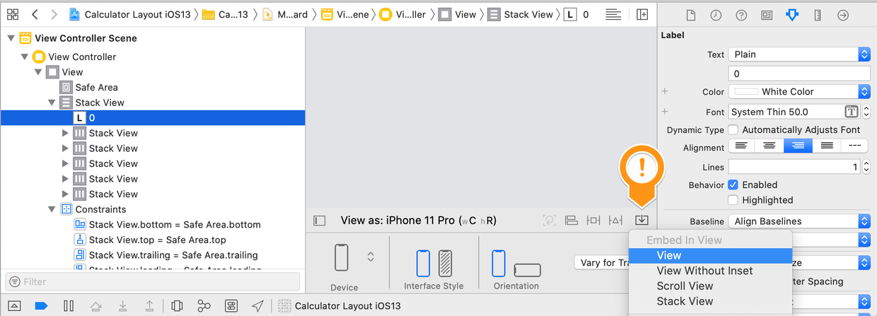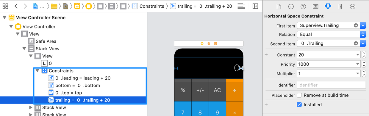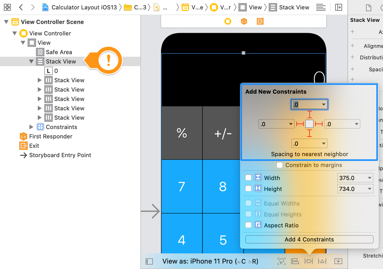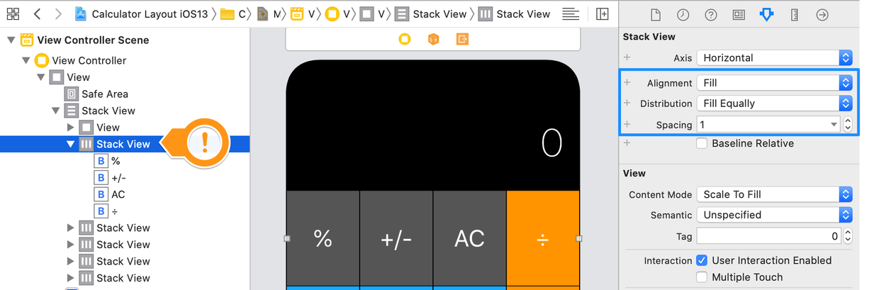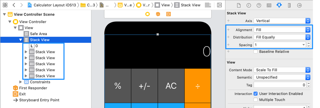 如果您希望0按钮和 . 按钮、=按钮占用一样大的空间,则需要将 . 按钮、=按钮嵌入到一个 stack view中。两个水平 Stack view 均将“ Distribution”设置为“Fill Equally”。