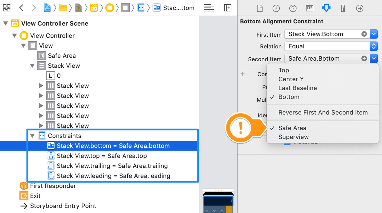将步骤3中设置的约束更改为相对于 Safe Area 而不是 superview 。
