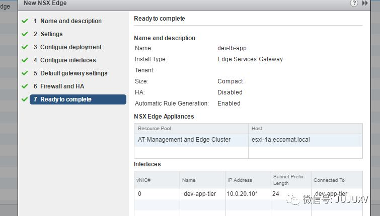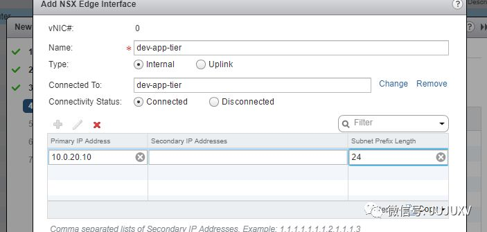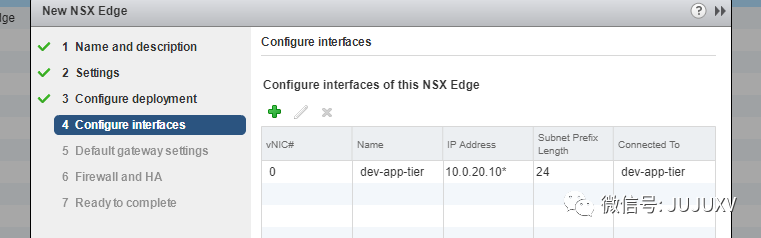 选择将Edge连接到dev-app-tier逻辑交换网络,并定义内部接口网络地址为10.0.20.10/24,与App01和App02是相同的地址段