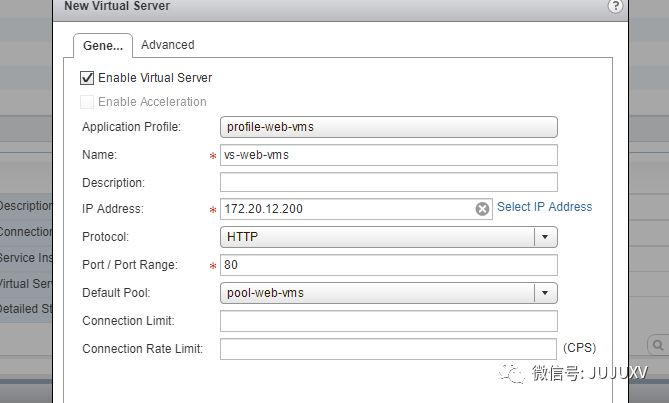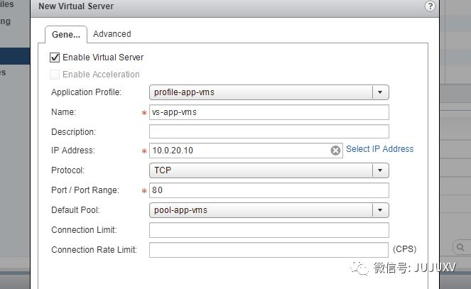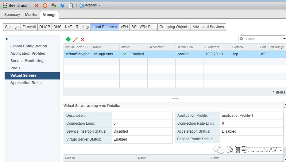 最后配置一台虚拟服务器,并设置dev-lb-app Edge的内部接口地址(10.0.20.10)作为App服务器负载均衡的VIP地址