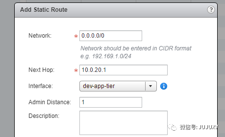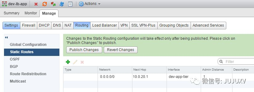因此,需要为dev-lb-app设置一条静态路由,0.0.0.0/0 NH=10.0.20.1,即dev-dlr的一个内部接口地址