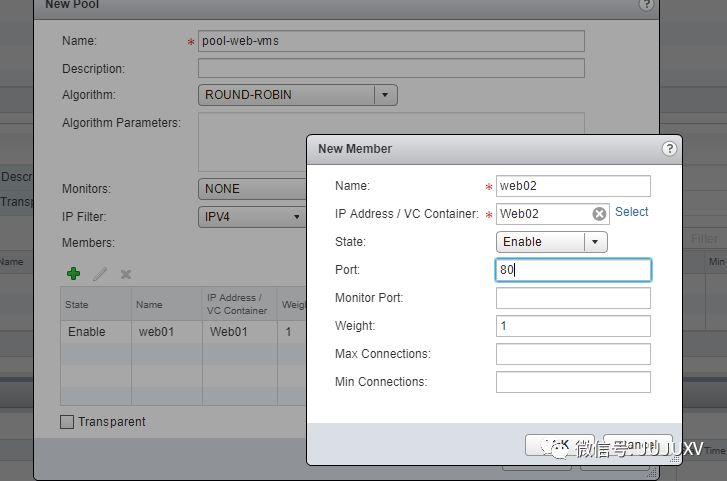 定义服务器池命名为pool-web-vms,将Web01和Web02添加到这个服务器池,作为负载均衡的成员服务器;管理员也可以为负载均衡定义多种算法,如常见的Round-Robin