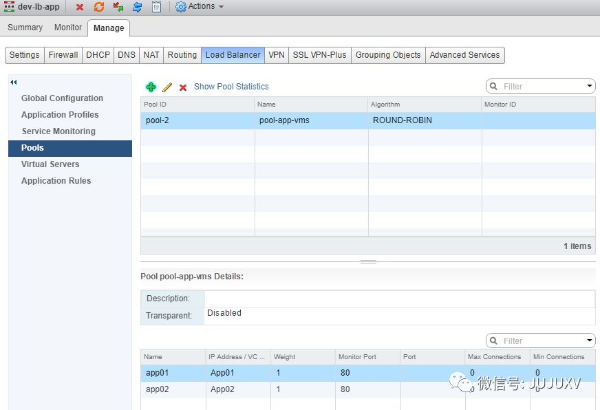 现在,我将借助刚才部署的dev-lb-app,实现App01和App02两台虚拟机的负载均衡。