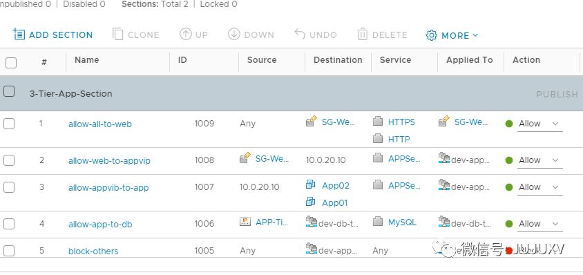 除此以外,出于对安全性的考量,我还需要为3-Tier-App业务设置分布式防火墙规则,借助于NSX的安全微分段实现对业务虚拟机的保护;
