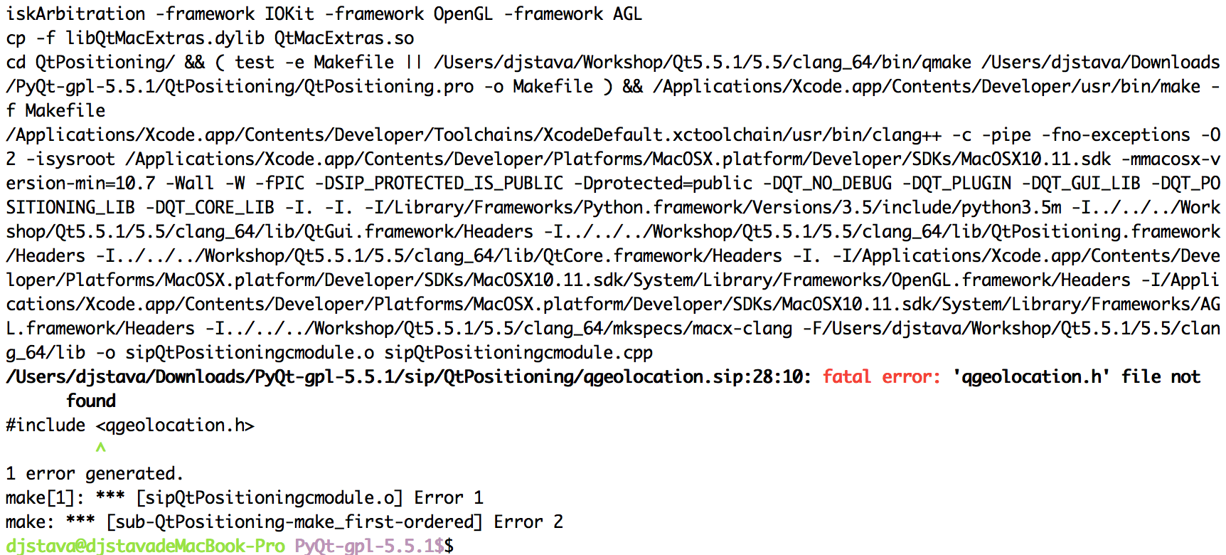 tar xvf PyQt-gpl-5.5.1.tar.gz cd PyQt-gpl-5.5.1 python3.5 configure.py --qmake ~/Workshop/Qt5.5.1/5.5/clang_64/bin/qmake --disable=QtPositioning -d /Library/Frameworks/Python.framework/Versions/3.5/lib/python3.5/site-packages make sudo make install