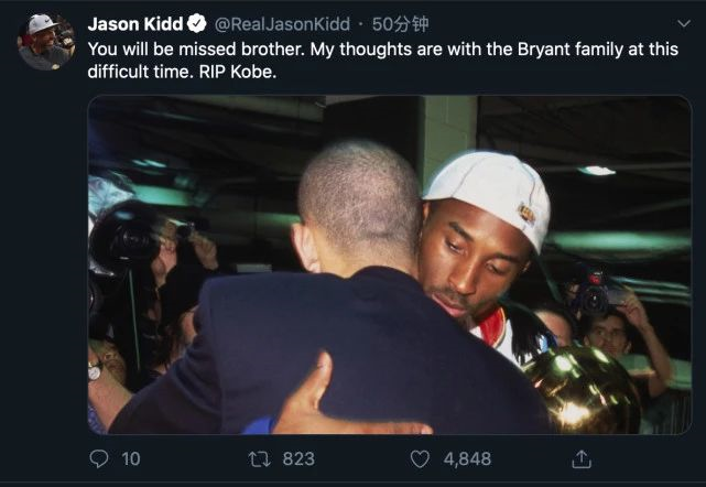 兄弟,我会永远纪念你,在这个艰难的时刻,我的信念和科比一家同在,愿灵魂安息,科比。