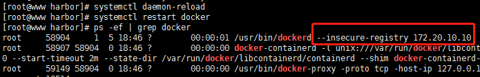 重启docker后查看docker进程会看到刚才加入的harbor地址:
