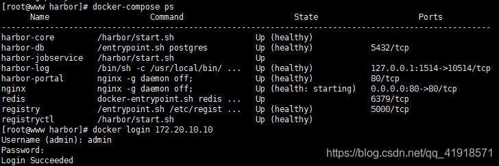 再进入到harbor目录重启docker-compose,之后用docker-compose ps查看各组件状态为healthy,再登录成功!