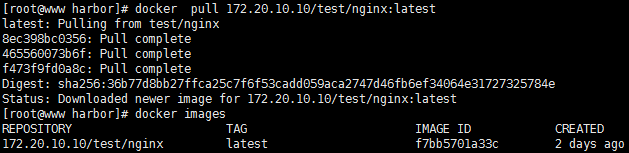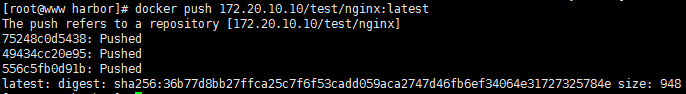 docker push 172.20.10.10/test/nginx:latest 上传镜像,后在harbor test项目里查看到即可。