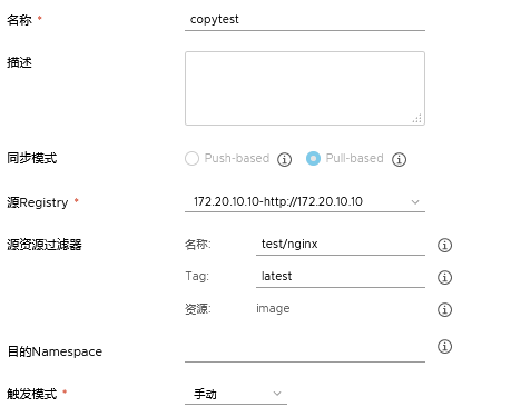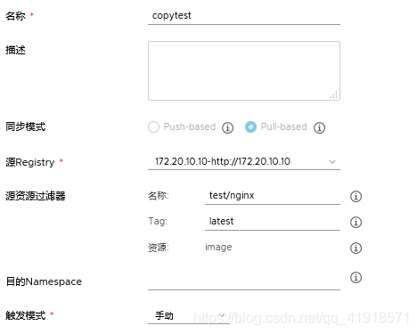 再同步管理里新建规则,填写源Registry地址,镜像名称、tag等,注意镜像名称是test/nginx,tag是latest。