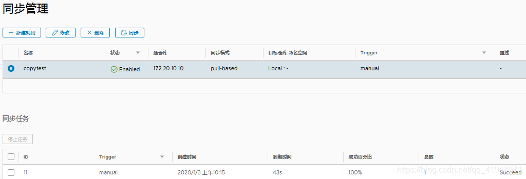保存后,选中规则,点击同步;在项目中查看拉取到的镜像即可。push镜像在主harbor上操作类似。