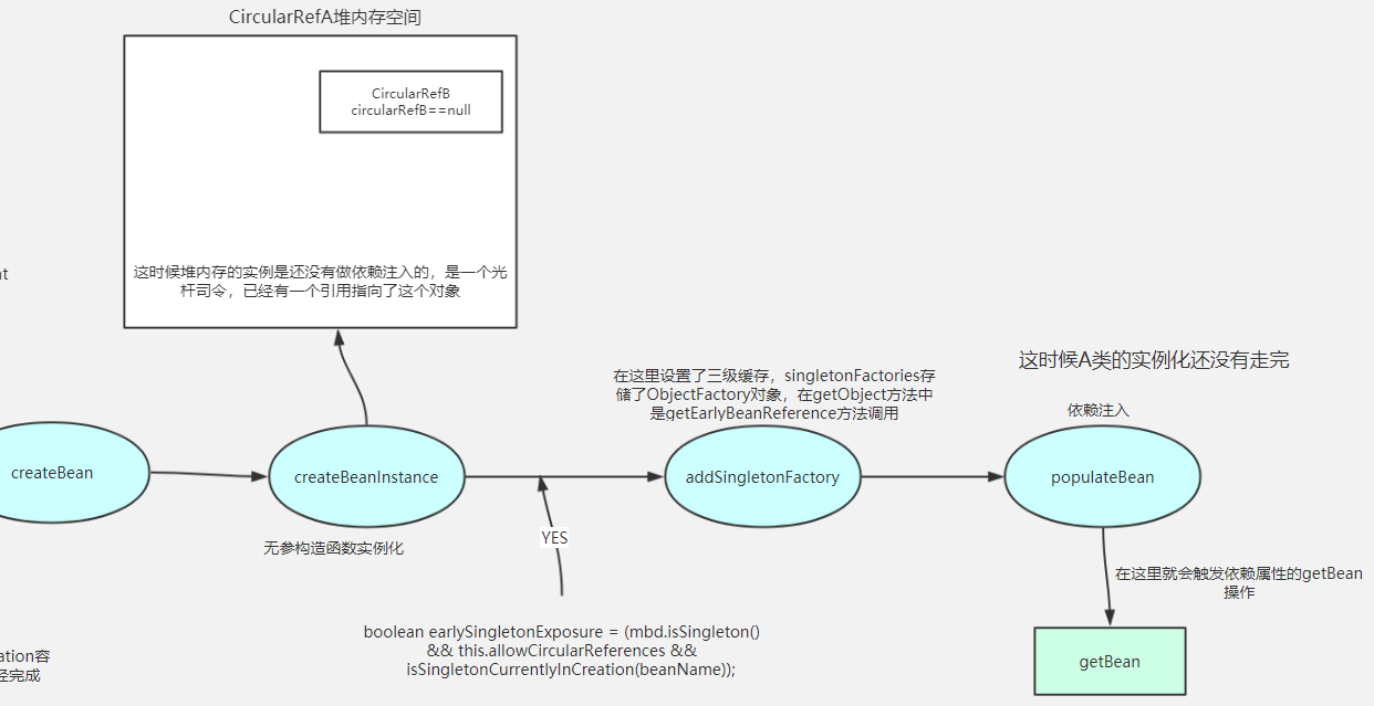 4)B类populateBean进行依赖注入,这里触发了A 类属性的getBean操作;