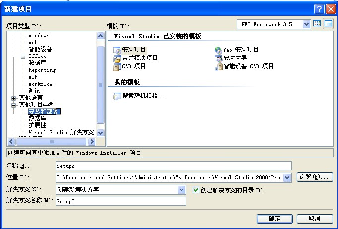 第一步:打开开发环境VS2008,新建项目,选择其他项目类型,再选择"安装项目",输入名称及选择安装路径;