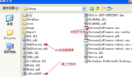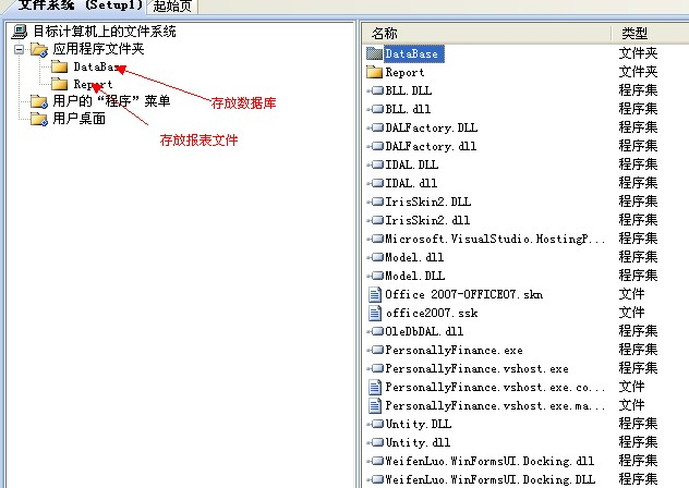 第三步:添加项目所需文件;这里有两个文件夹需要注意(DataBase和Report),因为DataBase是存储项目数据库,而Report则是存储项目所需的报表文件.rpt,因此呢,在应用程序夹中也需要建同名的文件夹,并且添加所需的文件。效果: