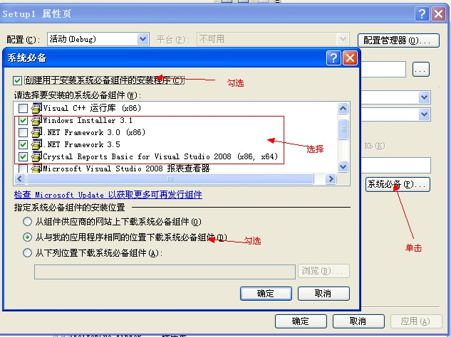5、为了避免目标计算机没有程序运行需求的.netframework2.0,需要自己打包进去,在安装时自动检测是否需要安装。在 菜单 "项目"--"Setup属性",在属性窗口你会看到一个"系统必备",点击进入,保证“创建用于安装系统必备组建的安装程序”被选,“.NET Framework2.0”被选,在“指定系统必备组件的安装位置”选择 第二项 "从与我的应用程序相同的位置下载系统必备组件",确定,确定。