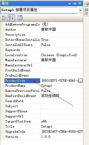 注意上面代码里的红字部分,这个就是你要打包的程序的安装与部署项目的ProductCode,那么这个ProductCode在哪里找呢?请记住,这里是两个系统,一个是你要打包的系统,另一个是控制台程序,所以啊,这点,要理解!去你要打包的项目里去找