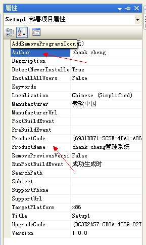 7,在Setup属性中可以自己设置“ProductName”和“Title”的内容;