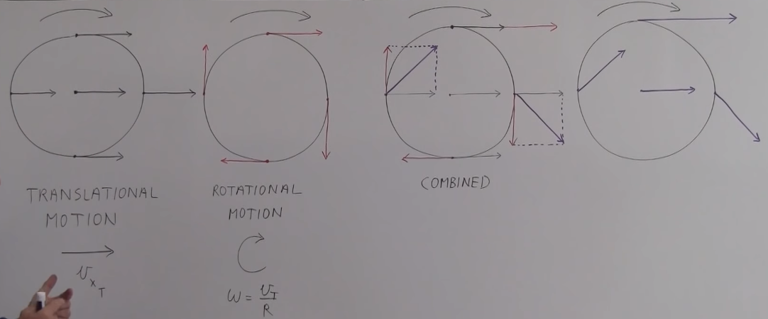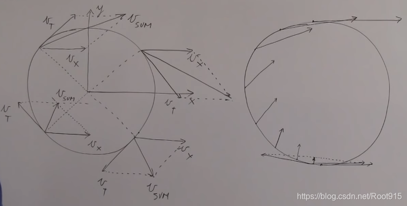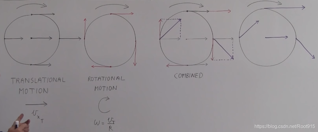 车轮上的每个点的运动方式有两种,translational motion,水平方向上移动,速度我们称为Vxt,车轮上每个点的运动方向一致,大小相同;车轮在水平移动的同时还进行自身旋转,totational motion,旋转的方向不同,角速度W和切向速度Vt的关系为,W=Vt/R;第三张图为结合后分析图,最下面的点,水平方向的速度和旋转速度结合后相互抵消;最上面的点,水平速度和旋转速度相加,大小为2Vxt;中心点不参与旋转,所以一直都有Vxt;第四张为结合后图解。