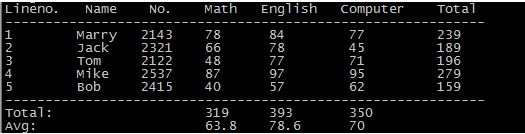 awk 'BEGIN{math=0;eng=0;com=0;printf "Lineno. Name No. Math English Computer Total\n";printf "------------------------------------------------------------\n"}{math+=$3; eng+=$4; com+=$5;printf "%-8s %-7s %-7s %-7s %-9s %-10s %-7s \n",NR,$1,$2,$3,$4,$5,$3+$4+$5} END{printf "------------------------------------------------------------\n";printf "%-24s %-7s %-9s %-20s \n","Total:",math,eng,com;printf "%-24s %-7s %-9s %-20s \n","Avg:",math/NR,eng/NR,com/NR}' test0