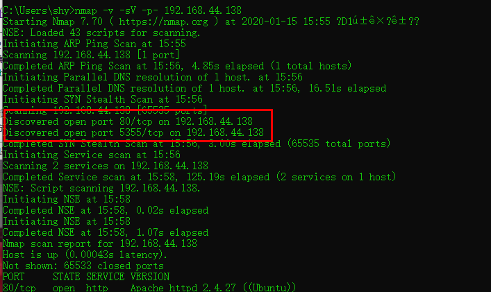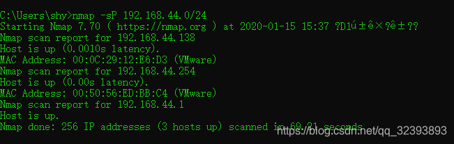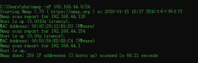 nmap -sP 192.168.44.0/24 使用ping命令来发现存活主机