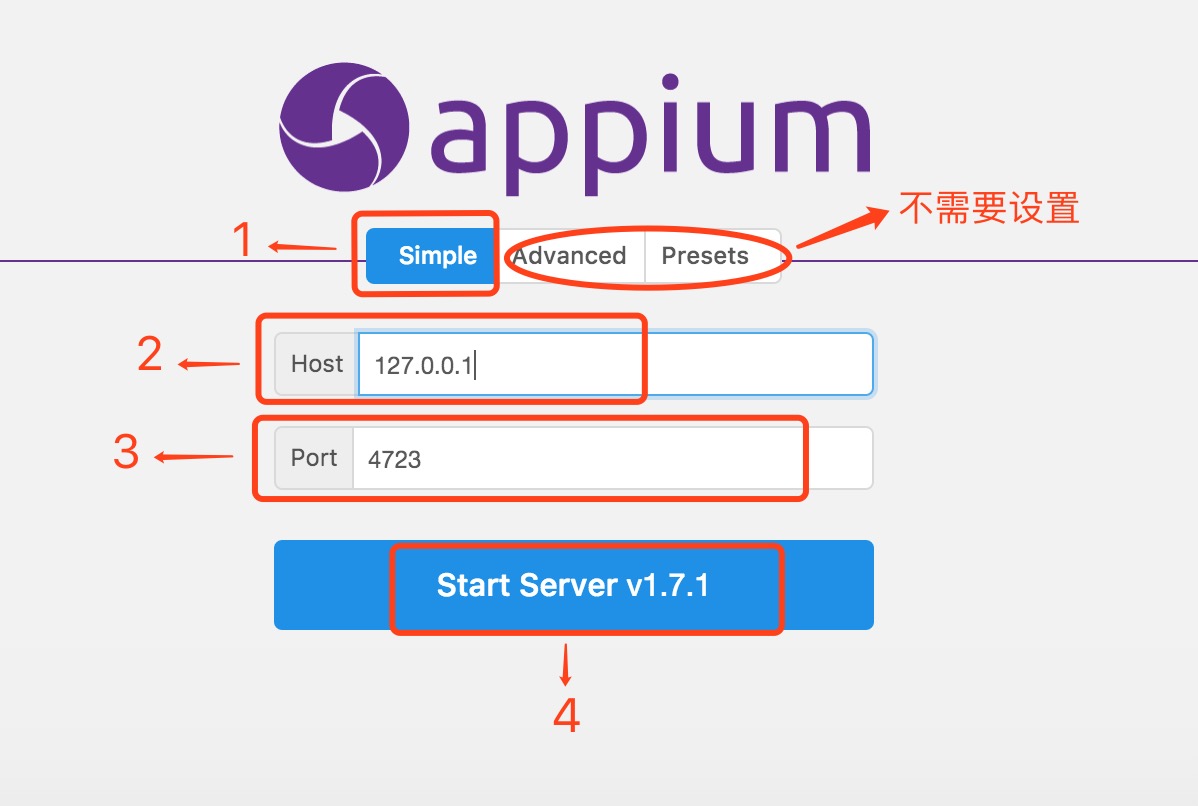 1. 运行appium-desktop-Setup-1.2.7.exe,默认安装即可 2. 启动客户端,按图片步骤 1 -> 2 -> 3 -> 4 设置