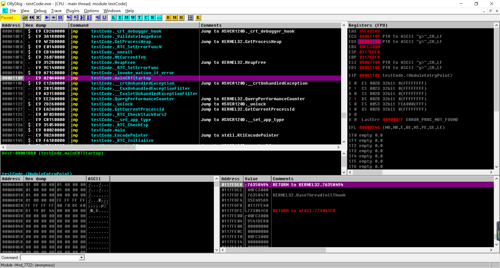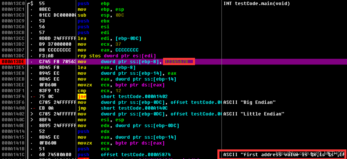 除了直接查看输出,我们还能通过查看内存方式自己看看存储的情况,这里使用ollyDbg调试上述程序debug模式输出的exe文件,使用ollyDbg打开该exe文件: