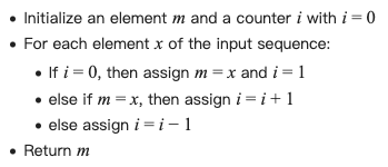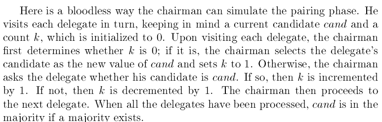 在场的有个叫onwaier的,他很聪明,他想到一个方法。他用他那犀利人目光扫一遍所有代表们的选票,在脑子记住两件事,当前的候选人的名字cand和他对应的计数k(并不是他的选票数)。起始时,k的值为0,看每个人的选票时,先想想现在k是否为0,如果是0就将cand更新为他将看到的候选人的名字并且将k的值更新为1。观察每个人选票的过程,如果这个人的选票与cand相同,则将k的值加1;否则,将k的值减1。最后的cand可能胜选,还需统计他的总选票数是否超过一半。