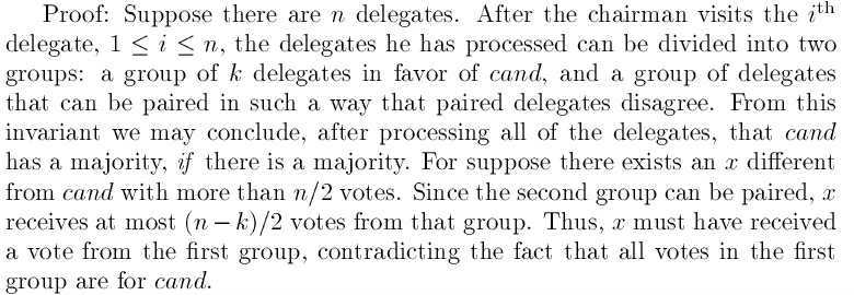 假设共有n个代表(一人一票,选票总数为n)。当onwaier看到第i个代表的选票时,前面他已经看到的所有选票可以分为两组,第一组是k个代表赞同cand;另一组是选票可以全部成对(选票不同)抵销。当处理完所有的选票时,如果存在大多数,则cand当选。