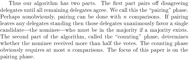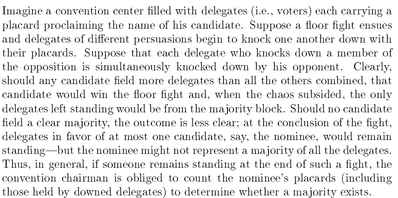 想象着这样一个画面:会议大厅站满了投票代表,每个都有一个牌子上面写着自己所选的候选人的名字。然后选举意见不合的(所选的候选人不同)两个人,会打一架,并且会同时击倒对方。显而易见,如果一个人拥有的选票比其它所有人加起来的选票还要多的话,这个候选人将会赢得这场“战争”,当混乱结束,最后剩下的那个代表(可能会有多个)将会来自多数人所站的阵营。但是如果所有参加候选人的选票都不是大多数(选票都未超过一半),那么最后站在那的代表(一个人)并不能代表所有的选票的大多数。因此,当某人站到最后时,需要统计他所选的候选人的选票是否超过一半(包括倒下的),来判断选票结果是否有效。