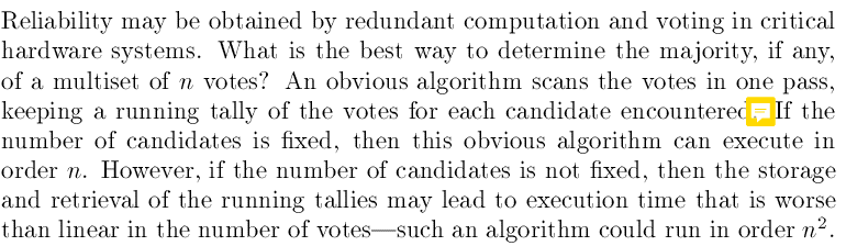 摩尔投票法(Boyer–Moore majority vote algorithm)出自论文,算法解决的问题是如何在任意多的候选人(选票无序),选出获得票数最多的那个。常见的算法是扫描一遍选票,对每个候选人进行统计的选票进行统计。当候选人的数目固定时,这个常见算法的时间复杂度为:,当候选人的数目不定时,统计选票可能会执行较长时间,可能需运行的时间。当选票有序时,可以很容易编出的程序,首先找到中位数,然后检查中位数的个数是否超过选票的一半。这篇论文针对无序且侯选人不定的情形,提出了摩尔投票算法。算法的比较次数最多是选票(记为n)的两倍,可以在时间内选出获票最多的,空间开销为。