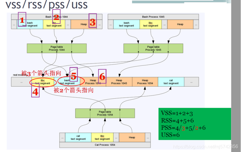 Linux 这么多进程在跑,每个进程都有各自的页表,下面这张图详细的描述了各个进程是如何瓜分内存条的。有一些是被不同进程共享的,描述一个进程有四个概念,一般说一个进程耗费多少内存,pss是最公平的,uss 一般用于观察内存泄漏就可以了,连续多点采用来判断。在linux 我们一般都是使用smem 这个工具比如 smem -P ^a.out 查看a.out内存消耗情况,嵌入式系统一般用smemcap 抓取tar包,在电脑上查看。