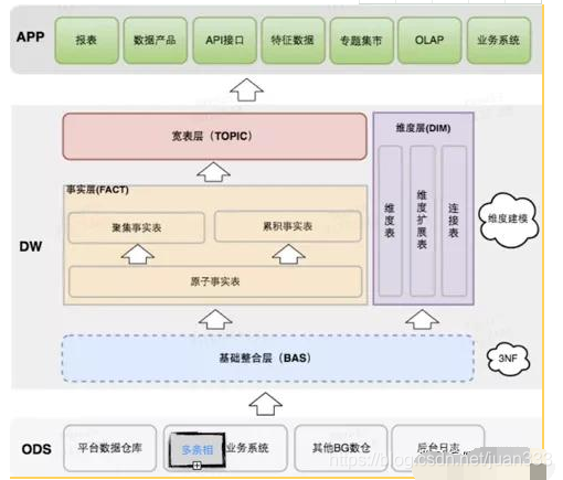 DW层:将ODS层作为直接的数据源,去建设满足业务分析要求的数仓,进行基础整合BAS,然后开发出事实层/维度层/宽表层。其目的将一大坨数据整合分类,方便快速查询。