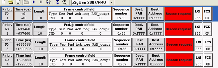 第三帧:协调器模块发出的信标请求帧,路由器模块在拿到这个帧之后,可以得到协调器模块相对于它自己的信号强度,判断是不是最佳介绍人。