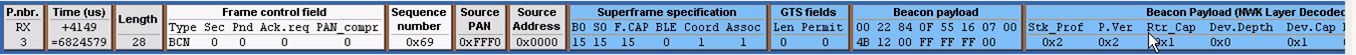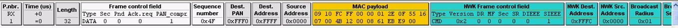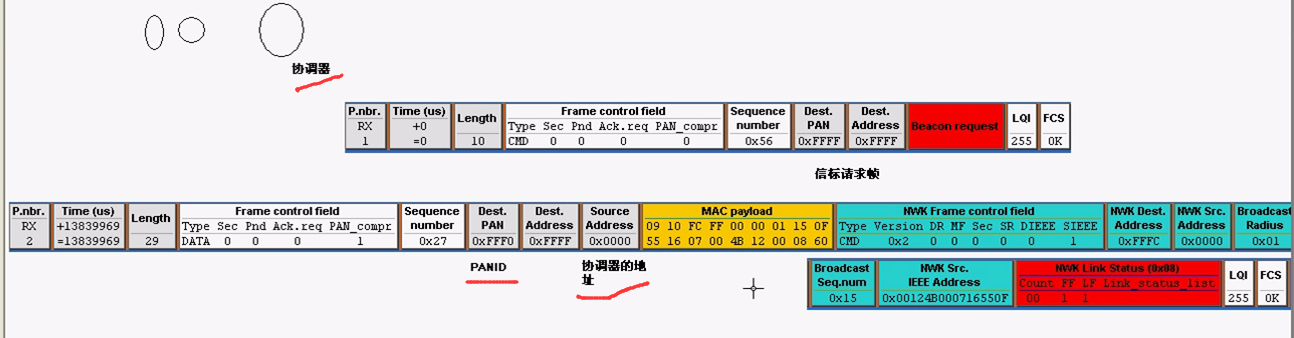 当协调器创建成功以后,就会发送一个数据帧,这个帧里面可以看到协调器的地址0x0000,以及PANID,可以把这个帧叫做网络连接状态帧。