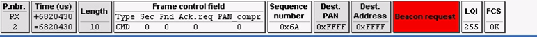 TYPE:为CMD命令帧格式。是信标请求帧,Beacon request;它的作用是,让在它附近的所有具备介绍人资格的节点,都回复信标帧,这些返回的信标帧被这个想要加入的无线模块拿到,通过这些信标帧,选出最佳介绍人节点,请求加入。