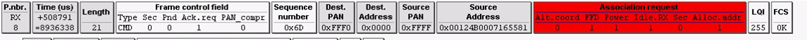 第八帧:是路由器模块发给协调器模块,这个帧的作用是,在前面路由器模块收到了协调器模块的信标帧,通过信标帧判断协调器是当前路由器模块的最佳介绍人,路由器模块发送这一帧高速协调器,你是我当前的最佳介绍人,请你从当我入网的介绍人,介绍我入网,并且在这个帧携带了自己的MAC,这个MAC地址是介绍人模块(协调器模块)给被介绍人模块(路由器模块)分配网络的地址的依据。