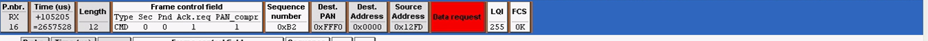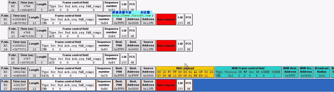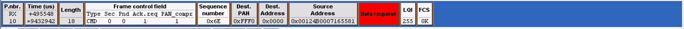 第十帧:是路由器模块发给协调器模块的帧,作用是请求协调器,把你根据我前面发给你的MAC地址给我分配的网络地址发给我,是一个数据请求帧