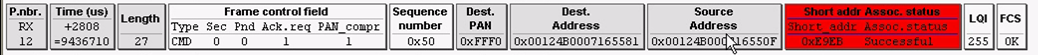 第十二帧:协调器把为路由器分配好的网络地址发给路由器。而这个帧需要非常明确的发给路由器模块,但路由器模块还不知道自己的网络地址是多少,所以在指定目标地址的时候用MAC地址,
