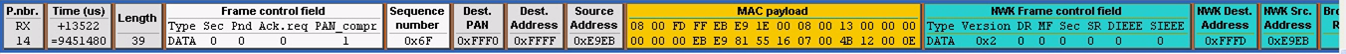 第十四帧:入网宣告帧,通过这个帧告诉当前网络里所有节点,我入网了,我的网络地址是0xE9EB。