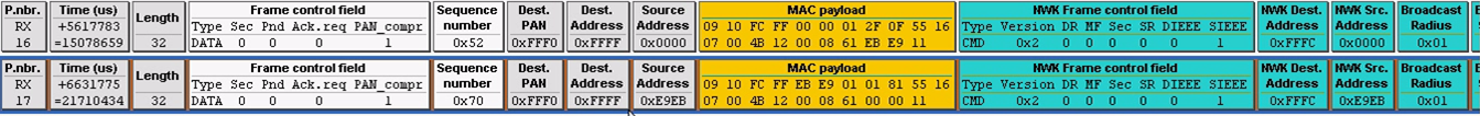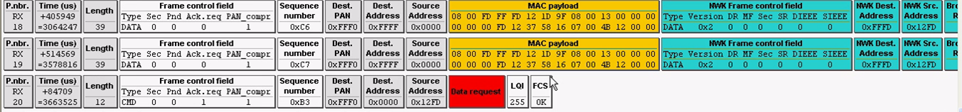 第十六帧和第十七帧:是协调器模块和路由器模块在工作稳定时,发出的网络连接状态帧。协调器和路由器在入网后,稳定工作时的行为是,每隔一段时间发一次网络连接状态帧,默认时间是15s(代码中可调)。