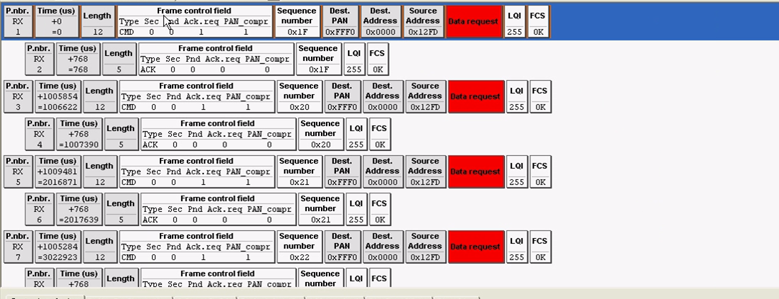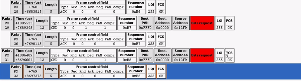 第十三帧:在路由器模块收到根据自己的MAC地址收到了协调器发过来分配给自己的网络地址,硬件自动回复ACK,表明已经收到了。