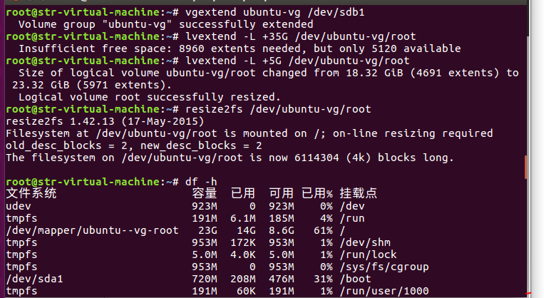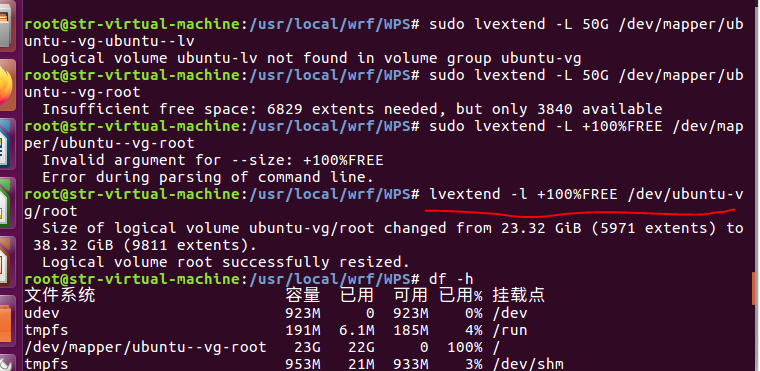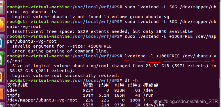 sudo lvextend -l +100%FREE (后面是位置)