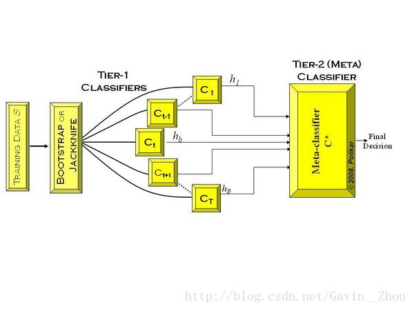 是指训练一个模型用于组合其他各个模型。即首先我们先训练多个不同的模型,然后再以之前训练的各个模型的输出为输入来训练一个模型,以得到一个最终的输出. 将训练好的所有基模型对训练基进行预测,第j个基模型对第i个训练样本的预测值将作为新的训练集中第i个样本的第j个特征值,最后基于新的训练集进行训练。同理,预测的过程也要先经过所有基模型的预测形成新的测试集,最后再对测试集进行预测.
